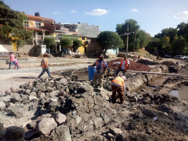 Más de 96.36 metros lineales de la calle, con rodamiento de piedra bola y huellas de concreto hidráulico, áreas verdes y pasillos de concreto estampados, 4 luminarias leds, líneas de agua potable y drenaje sanitario, serán las acciones que se realizarán en su totalidad en la Primera Etapa de pavimentación de la calle Prolongación Ojo de Agua, en la comunidad.