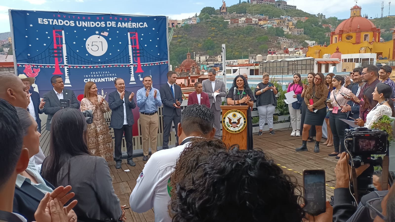 Los gobernadores de Guanajuato y Sonora, Diego Sinhue Rodríguez Vallejo y Alfonso Durazo, así como el embajador de los Estados Unidos, Ken Salazar, la secretaria federal de Cultura, Alejandra Frausto y otros funcionarios, realizaban el ceremonial de las inauguraciones.