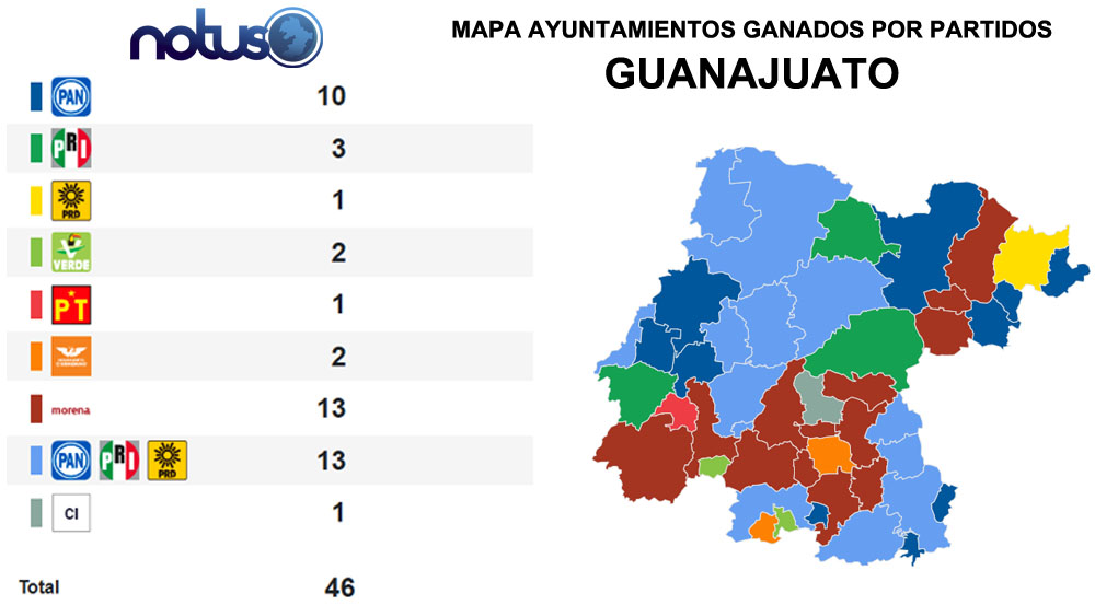 Guanajuato.- En Guanajuato MORENA obtuvo 13 alcaldías de las 46 disputadas; el PAN como partido solamente se llevó 10 y otras 13 por la coalición PAN-PRI-PRD. En el 2021, el blanquiazul ganó 26 ayuntamientos e iba sin alianza.