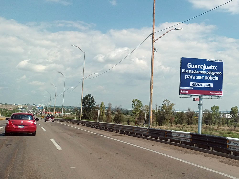 El otro espectacular dice “Guanajuato el Estado más peligroso para ser policía, gracias PAN” y en la parte baja del anuncio señala al Movimiento de Regeneración Nacional Morena.