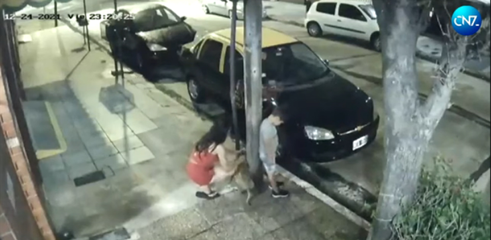 En el video retomado de una cámara de videovigilancia que ya se ha vuelto viral, es posible observar a una mujer con un vestido rojo, acompañada de un niño y un perrito, al cual sostienen de una correa, acercarse a un poste en la calle.