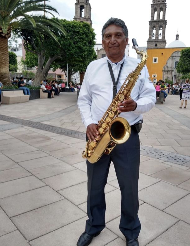 Irapuato, Gto.- Gustavo López integrante de la Banda Municipal de Irapuato cuenta con 30 años dentro de esta banda musical de viento y toca el saxofón tenor su pasión y gusto por la música nació desde muy pequeño; su papá perteneció a esta banda igual que dos de sus hermanos.