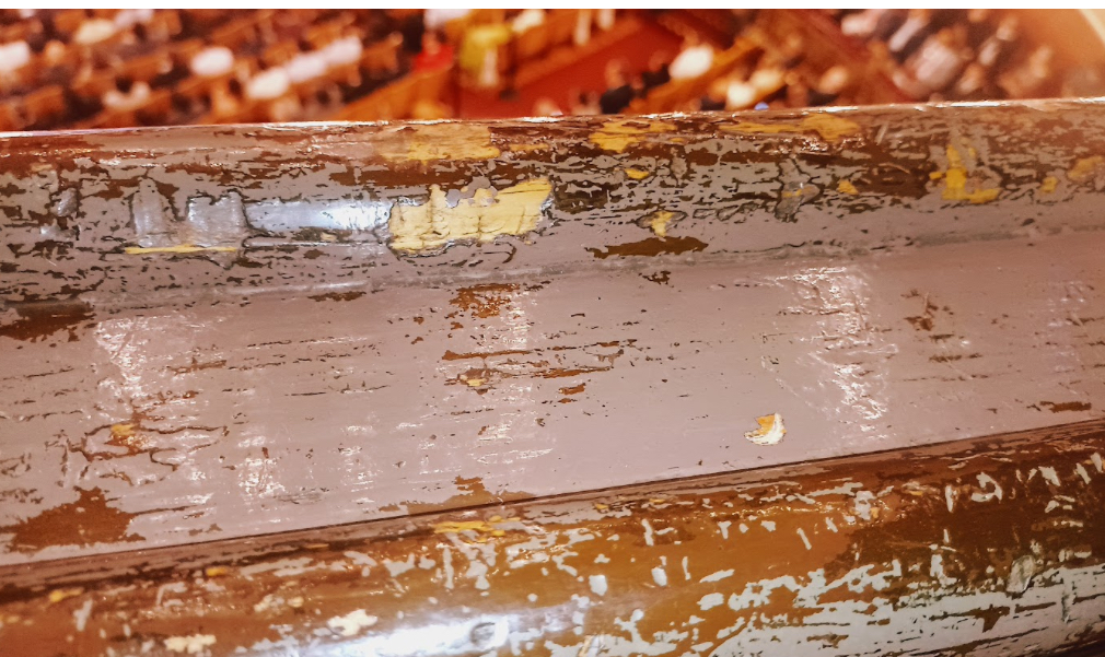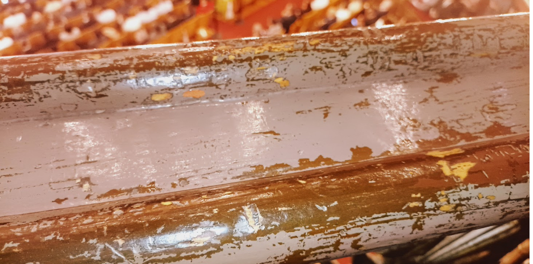 Los pasillos estaban limpios y se notaba la mano de pintura en muchos lugares, pero había señales de muros sin restaurar. En los palcos hay butacas “grabadas” con mensajes de amoríos de escuela secundaria y rayones con “recuerdos” de turistas inconscientes.