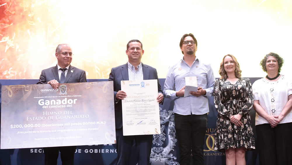 Y el mayor reconocimiento para Eduardo Francisco Muñoz Esquivel quien resultó ganador de este concurso. “Muchas felicidades. Tu inspiración y tu talento, expresados en la letra y la música del que a partir de hoy ha de ser el Himno del Estado, resonarán en todas partes enalteciendo a Guanajuato”, enfatizó Rodríguez Vallejo.