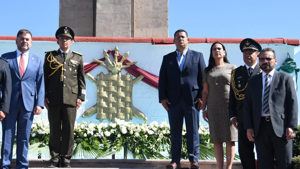 La presidenta municipal, Lorena Alfaro García, en compañía del gobernador del Estado, Diego Sinhue Rodríguez Vallejo y del General de Brigada Diplomado Estado Mayor, Enrique García Jaramillo, comandante de la 16va Zona Militar encabezaron la ceremonia cívico-militar.