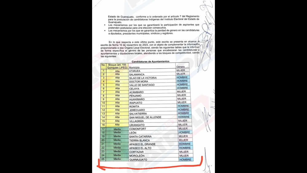 En el documento entregado al IEEG se establecen los géneros de las candidaturas a alcaldías y diputaciones en todo todo el estado. En la capital del estado, tanto la candidatura para la Presidencia Municipal como para la diputación son para hombres.