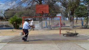 Después y mediante un incendio controlado, elementos de Protección Civil llegaron a la institución educativa para mitigar el incendio, por su parte los paramédicos mostraron la forma en que se auxilia a una persona accidentada.