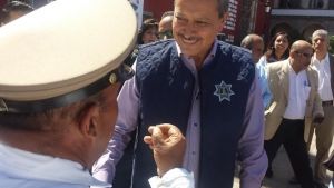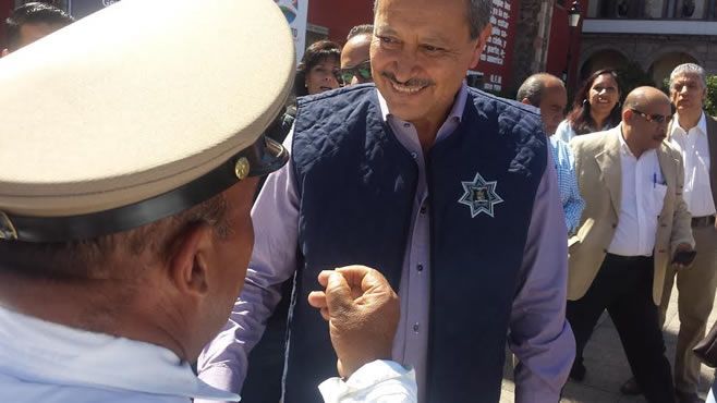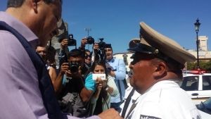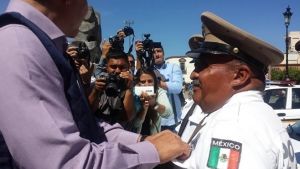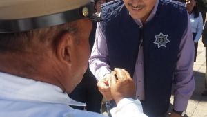 Durante la entrega de equipo como patrullas, autos y uniformes a la Dirección General de Movilidad y Transporte en la Plaza de Los Fundadores, mientras el alcalde realizaba junto a otras autoridades municipales la entrega de las llaves de las nuevas unidades a los elementos, con las que se reforzará a la dependencia, Ricardo Ortiz se acercó a “Crucito” y entregó ese pequeño detalle como reconocimiento a su trabajo.