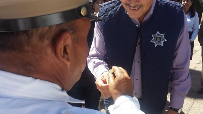 Irapuato, Guanajuato.- El presidente de Irapuato, Ricardo Ortiz Gutiérrez colocó en la camisola del elemento de tránsito mejor conocido como “Crucito”, un prendedor del escudo de Irapuato como un reconocimiento simbólico al trabajo que ha brindado muchos años a la corporación.