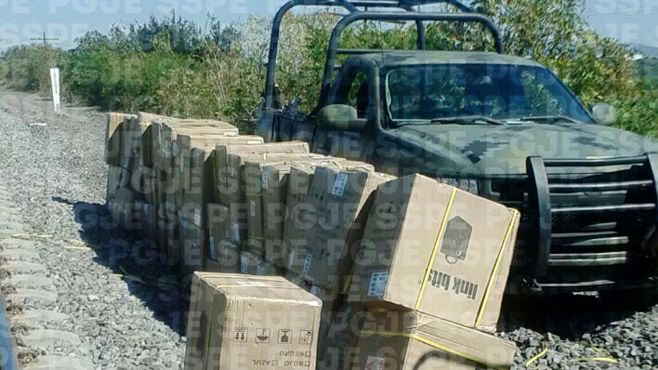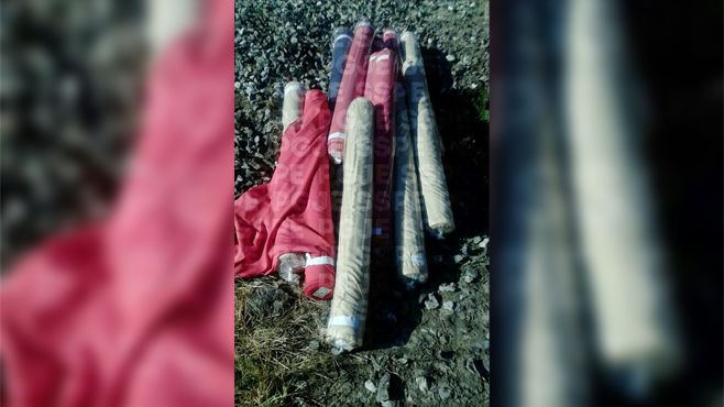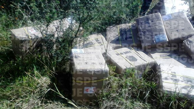 En tanto, en la comunidad de El Zapote-Viborillas, se recuperaron 8 rollos de tela con un grosor de 30 centímetros, por 2.5 metros de ancho, así como tres envoltorios conteniendo bolsos para dama.