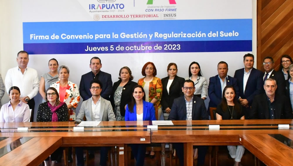 Con la finalidad de impulsar el desarrollo en las colonias y dar certeza jurídica a familias irapuatenses, el Gobierno de Irapuato firmó un convenio de colaboración con el Instituto Nacional del Suelo Sustentable (INSUS), institución encargada de impulsar acciones de regularización y gestión del suelo urbano en México.
