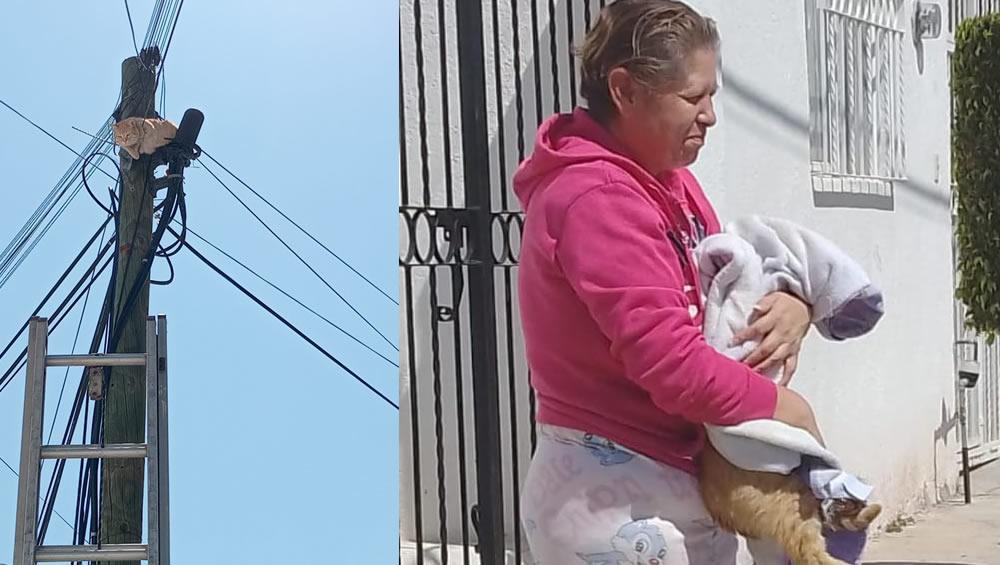 La Policía Ambiental de Guanajuato y el cuerpo de Bomberos SIMUB rescataron a un gatito que estaba en lo alto de un poste, atrapado entre el cableado.