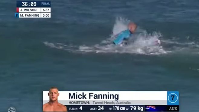 Fanning, de 34 años, está sentado en su tabla esperando las olas cuando nota un impacto. Inmediatamente se gira y comienza a remar, consiguiendo escapar del ataque. Momentos después es remolcado por una moto acuática de la organización.