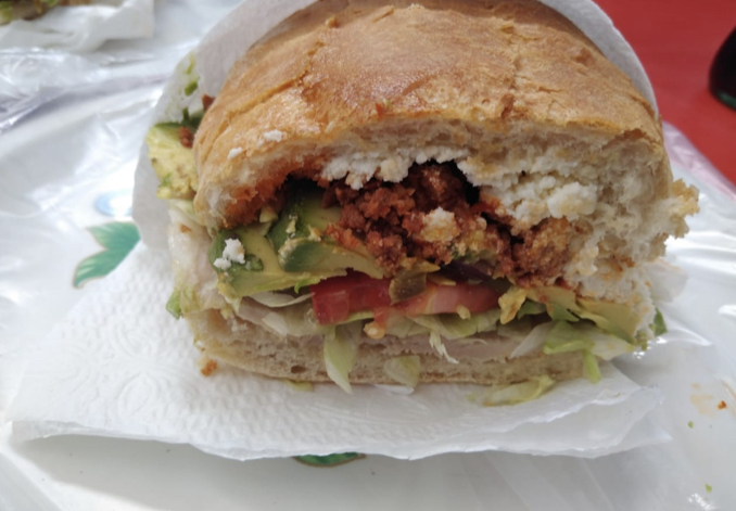 Su especialidad es la torta panteonera que lleva de todo, chorizo, carne de pierna de cerdo, queso asadero, requesón, jamón, aguacate, lechuga, jitomate, cebolla y picante.