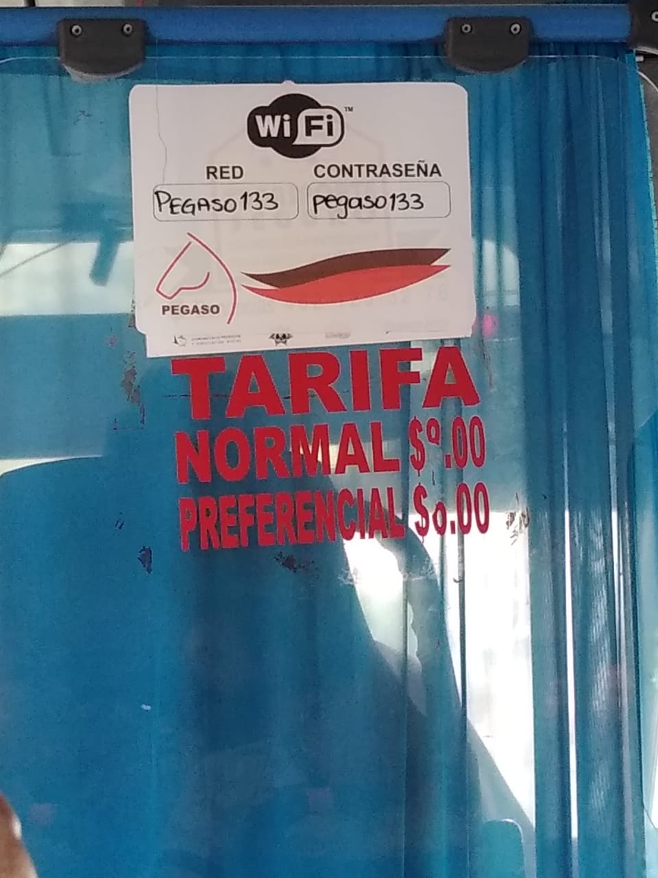 Uno de los camiones de la ruta 7 mostró un anuncio que dice “Este camión ya cuenta con cámara oculta y de monitoreo” así como otro anuncio donde ofrecen internet gratis “Wifi Gratis red y contraseña”.