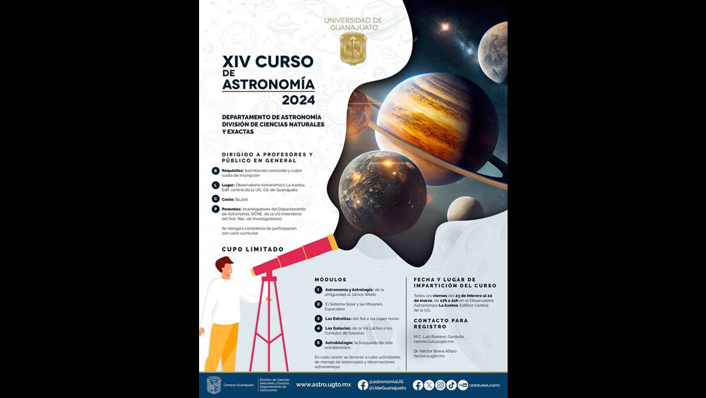 Guanajuato, Gto.- Como ya es tradición desde la primavera de 2007, el Departamento de Astronomía, de la División de Ciencias Naturales y Exactas de la Universidad de Guanajuato (UG), invita al público en general para participar en su XIV Curso de Astronomía, el cual se realizará en el Observatorio Astronómico, ubicado en la azotea del Edificio Central, en Guanajuato capital.