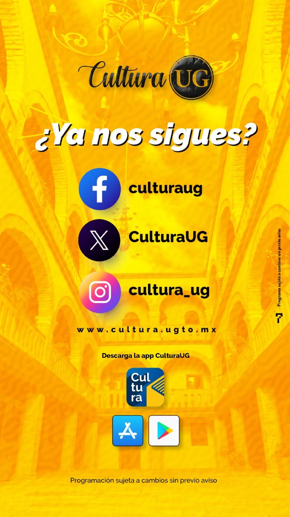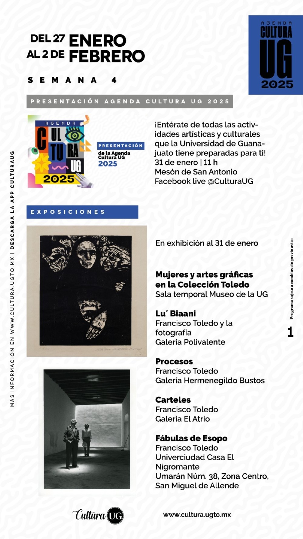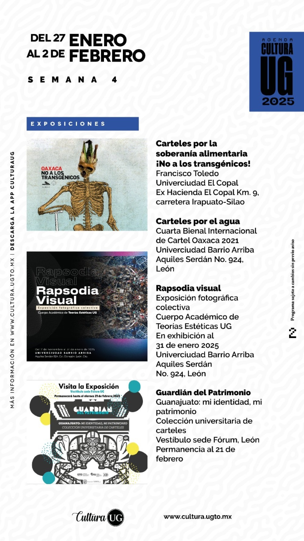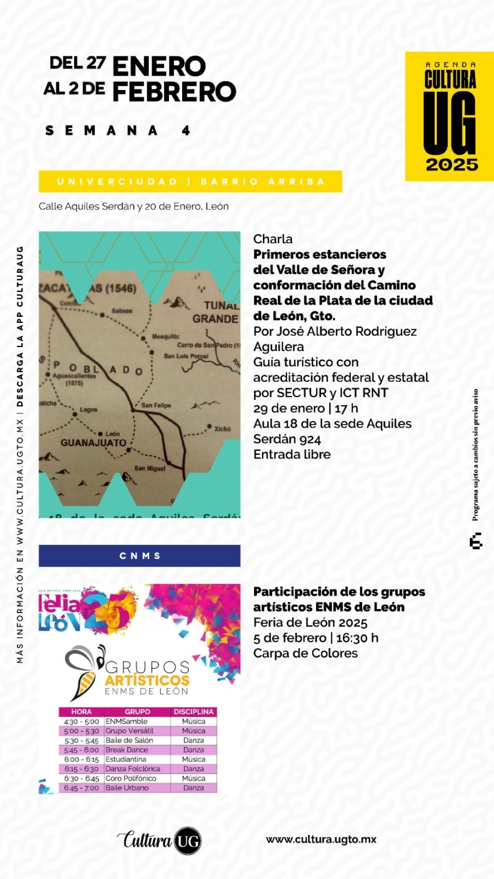 La oferta cultural de la Universidad de Guanajuato se encuentra completa en el sitio web www.cultura.ugto.mx y a través de sus redes sociales @Cultura UG. Programa sujeto a cambios sin previo aviso.