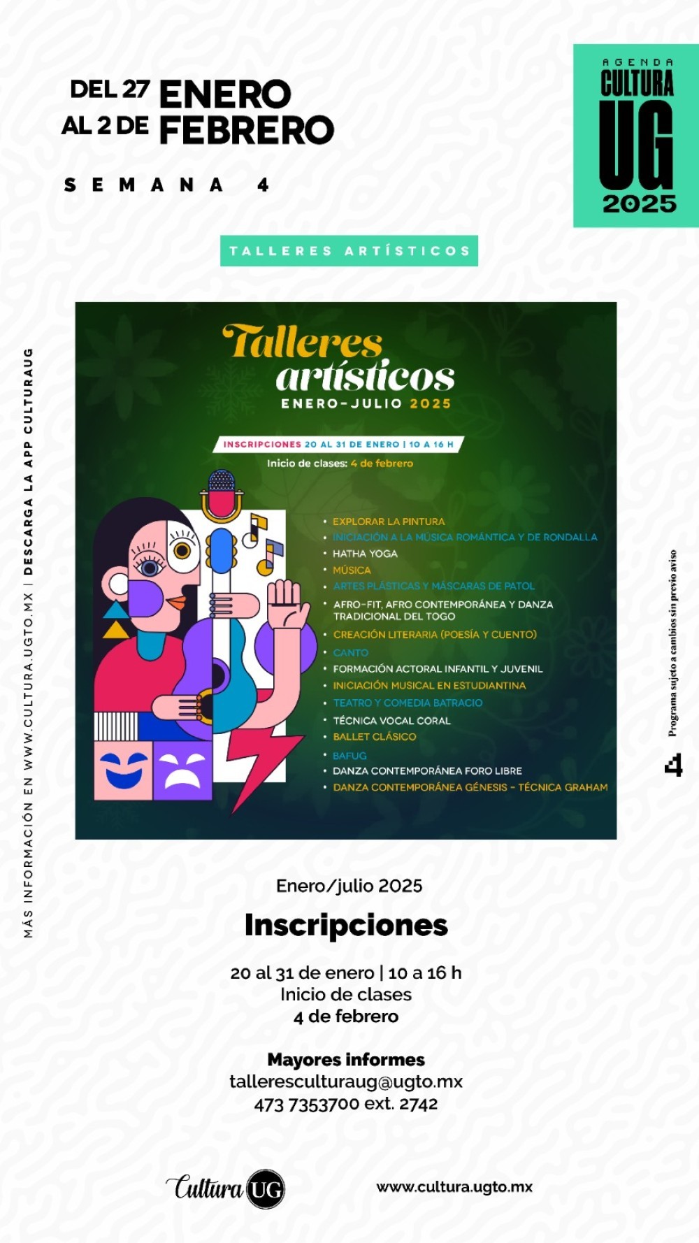 Las inscripciones a Talleres Artísticos del periodo enero-julio 2025 se llevarán a cabo del 20 al 31 de enero de 10:00 a 16:00 horas, para iniciar clases el 4 de febrero. Para mayores informes se dispone del correo talleresculturaug@ugto.mx y la línea telefónica 473 7353700 ext. 2742.