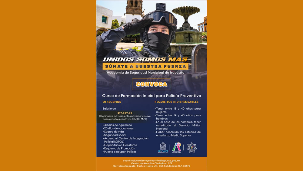 Irapuato, Gto.- Para fortalecer las filas de la corporación y brindar un servicio de calidad a la población, la Secretaría de Seguridad Ciudadana (SSCI) mantiene abiertas durante todo el año las convocatorias para el curso de formación inicial.
