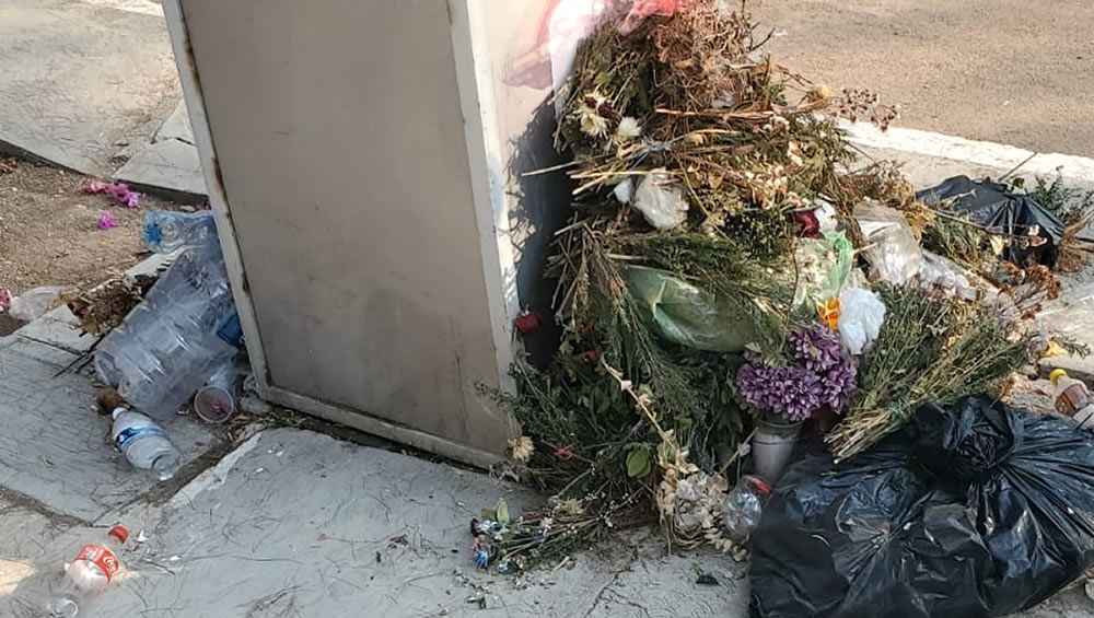 Inclusive se exhibe una fotografía tomada donde se muestra un bote de basura llenó, rodeado de bolsas de basura adicionales, lo que hizo pensar a las personas que los servicios públicos no han pasado a recoger la basura generada en el cementerio durante varios días.