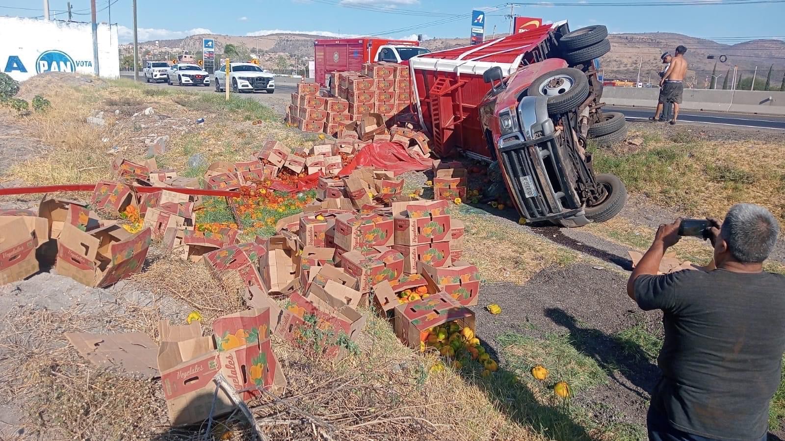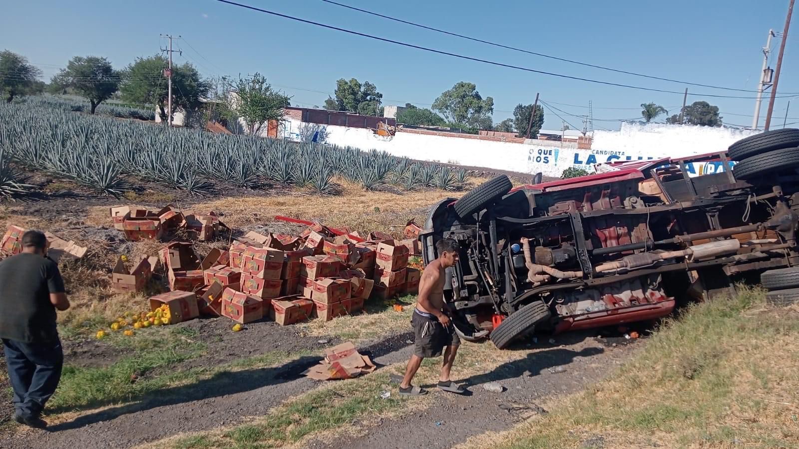 Una camioneta que transportaba vegetales sufrió una volcadura, quedando fuera de la carretera, a unos metros de unos campos de agave de la zona. El incidente ocurrió aproximadamente a las 5:30 de la tarde, cuando conductores alertaron a las autoridades a través del sistema de emergencias 911.